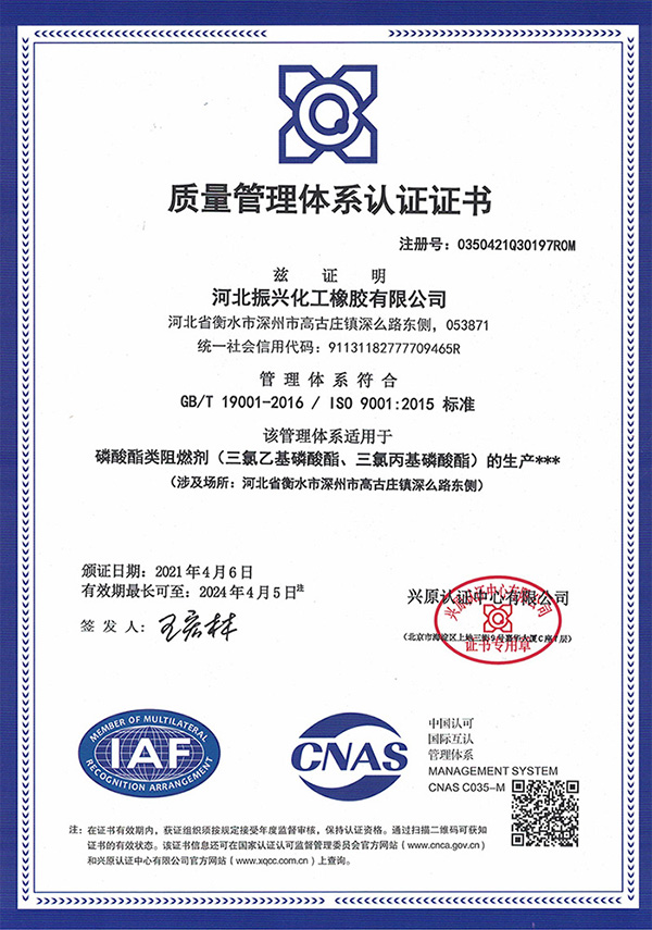 河北振興化工橡膠有限公司座落在河北省深州市高古莊鎮化工園區。公司始建于1990年,占地面積20000m2,建筑面積12000m2固定資產500多萬元,現有員工135人,其中工程技術人員10多人。公司主要產品有磷酸三(2-氯乙基)酯(TCEP)、磷酸三(2-氯丙基)酯(TCPP)、三芳基磷酸酯(IPPP)、磷酸三乙酯(TEP)、磷酸三(2,3-二氯丙基)酯(TDCPP)等。公司擁有先進的設備,嚴格的檢測標準,完善的售后服務,科學的質量管理體系,專業打造較好的產品,公司擁有悠久的高品質產品,產品設計,制造,性能,質量達到先進水平。我們堅持質量求發展,本著誠信贏得客戶的經營宗旨,與各界朋友真誠合作,···